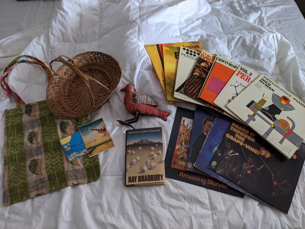 I completed my shopping research the night before and made a list of the stores we wanted to visit in order. We started in Kitty Hawk and went south. We didn’t buy something in every store but we had fun searching for treasures. I’ll list the stores below. After visiting 8 of the 12 on our list, we went back to the hotel to freshen up and enjoy our finds. We spent $63.75 total for everything shown in the picture below: 1 basket, 2 vintage postcards, 1 tote bag made from upcycled material, 1 bird figurine made from recycled metal in India, 1 book, and 11 vinyl records.