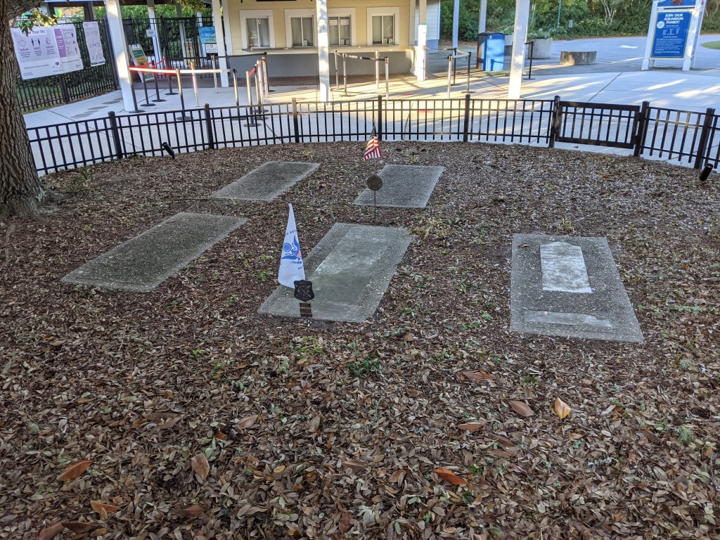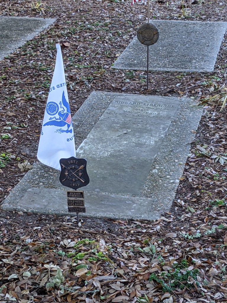At my request we made one last stop in Manteo at the North Carolina Aquarium. It wasn’t open but that didn’t matter because what I wanted to see was out front. Buried outside the front door is Richard Etheridge and members of his family. His gravesite had remained hidden since before World War II when the county had started building an airport. The US Navy took over the airport during the war and built an infirmary over the small cemetery. The building was torn down in the 1970s for the predecessor to the aquarium and and the aquarium director began to research Mr. Etheridge and erect educational signs.