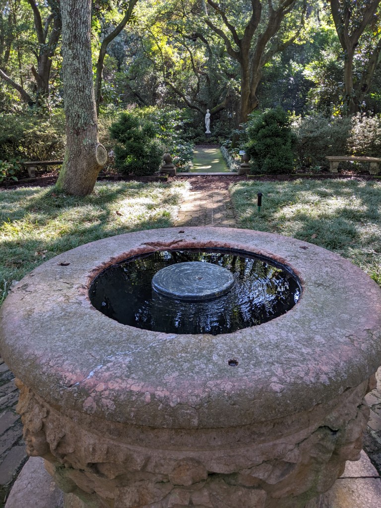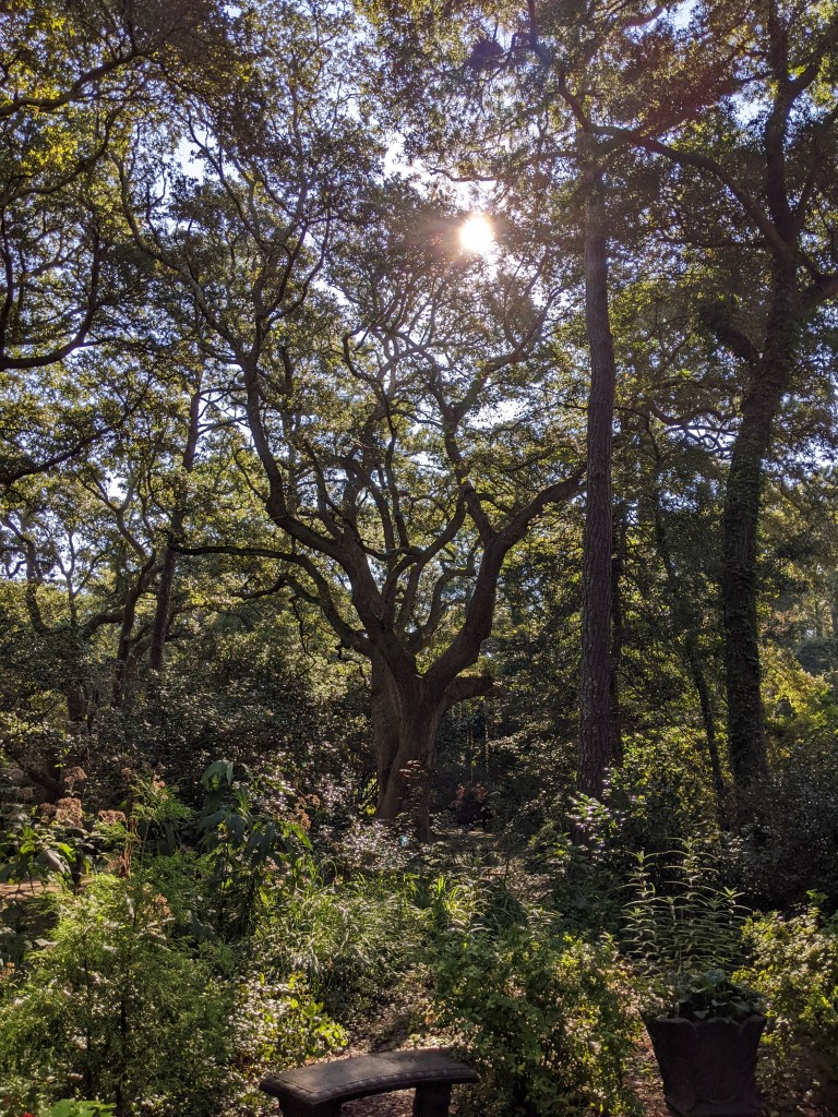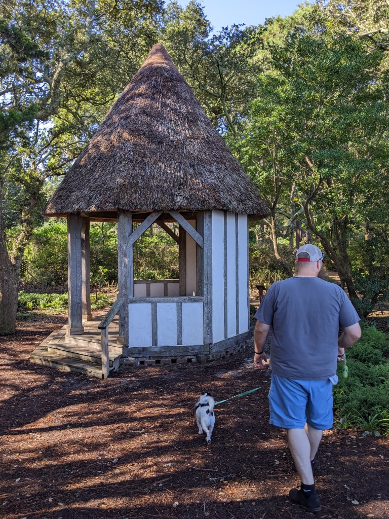 We decided to do the tourist thing on our first day, so we drove over to Manteo on Roanoke Island to visit the Elizabethan Gardens, managed by the Garden Club of North Carolina, and the Fort Raleigh National Historic Site. There’s an admission fee for the garden, including $3 for dogs, but it was worth it. It’s a beautiful place. We were the only people in the gardens besides staff, so we were able to fully enjoy it.