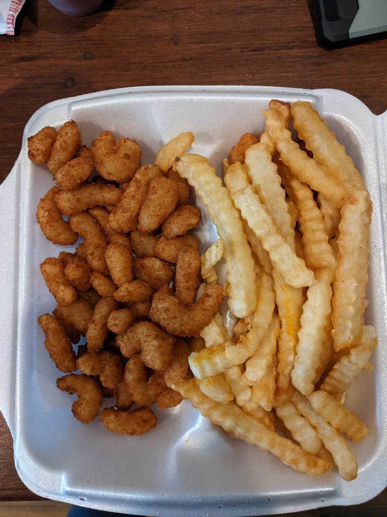 We managed to travel to the beach during the last week of the hottest summer heat, so after our walk through the garden we decided to head back to the hotel. We settled Percy in the room and then drove to John’s Drive-In to grab lunch to go. I enjoyed the popcorn shrimp and Cecil had chicken tenders. Everything was fresh and delicious!
